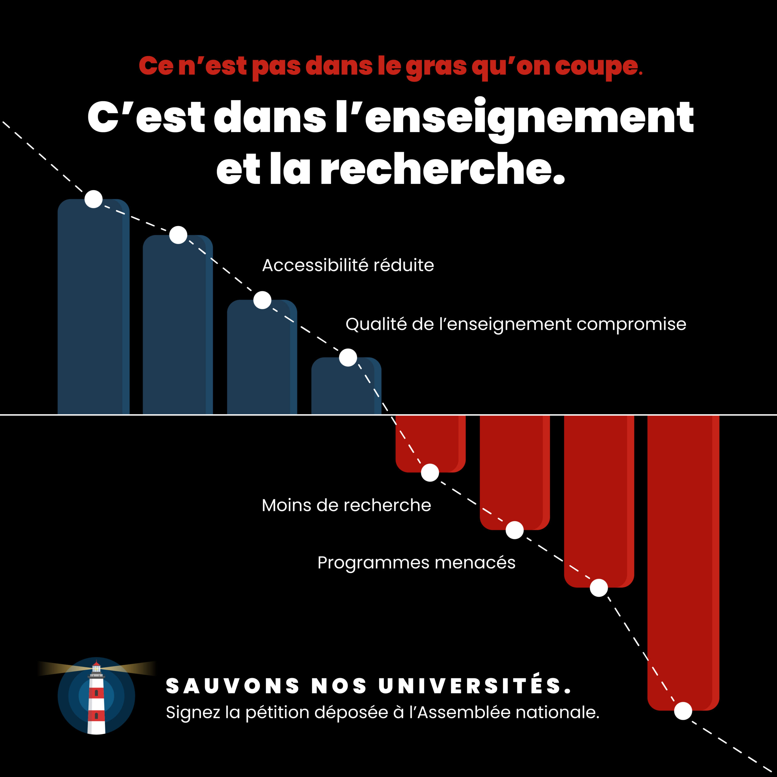 What does this mean for the coming years? Cuts to faculties, decreased financial aid for students, threatened programs, service reductions, increased workloads for professors and staff, and a real risk of certain programs disappearing.