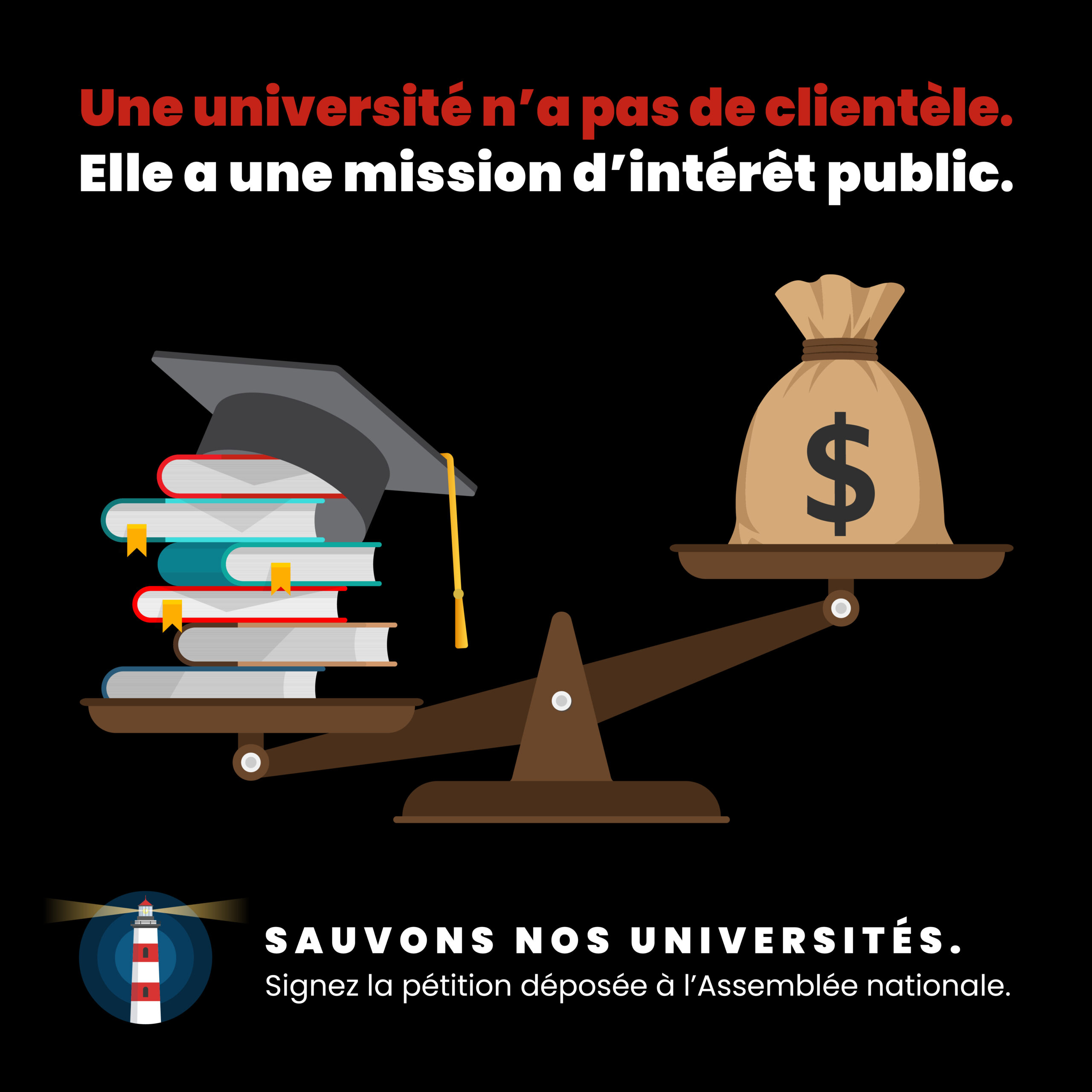 - First, sign the petition tabled at the National Assembly: “Restoring and protecting the university mission in Quebec”.